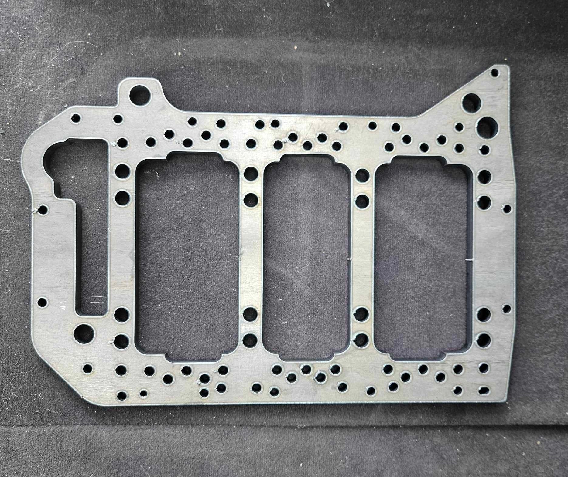 - Electroplated steel girdle, laser cut, then CNC machined, and final surfacing to ensure no warpage and completely flat. Anodized aluminum oil pump tube spacer