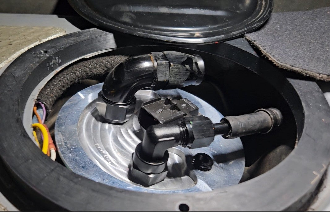 Our spacer allows the use of -10 free flow style hose ends for superior flow capacity. Raises the access lid about .5" (13mm) for minimal intrusion into the trunk.